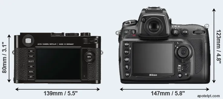 The above size and weight comparisons are to some extent incomplete since they do not consider the interchangeable lenses that both of these cameras require. Both cameras have similarly sized sensors, but DSLRs have a larger flange-to-focal plane distance than mirrorless cameras, which imposes contraints on the optical engineering process and generally leads to bigger and heavier lenses. You can compare the optics available for the two cameras in the Leica M Lens Catalog (M Typ 262) and the Nikon Lens Catalog (D700).