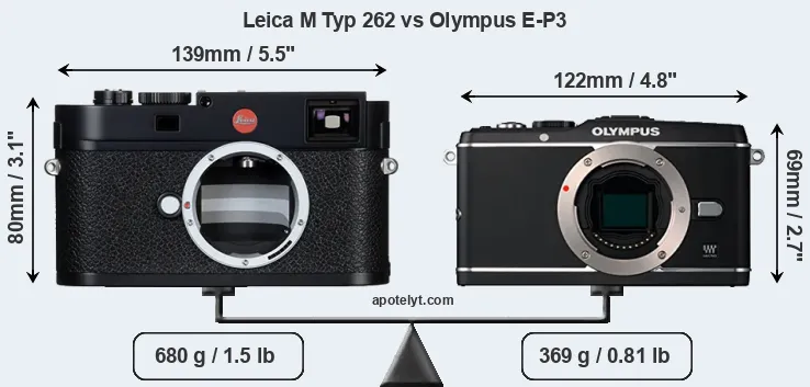 If the front view area (width x height) of the cameras is taken as an aggregate measure of their size, the Olympus E-P3 is notably smaller (24 percent) than the Leica M Typ 262. Moreover, the E-P3 is substantially lighter (46 percent) than the M Typ 262. It is worth mentioning in this context that the M Typ 262 is splash and dust resistant, while the E-P3 does not feature any corresponding weather-sealing.