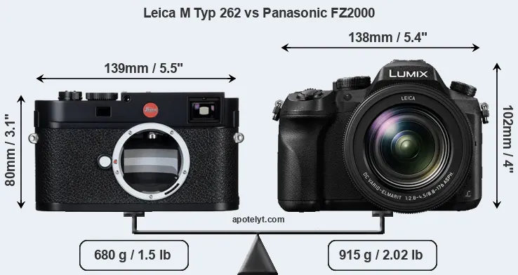The physical size and weight of the Leica M Typ 262 and the Panasonic FZ2000 are illustrated in the side-by-side display below. The two cameras are presented according to their relative size. Three successive views from the front, the top, and the rear are shown. All width, height and depth measures are rounded to the nearest millimeter.
