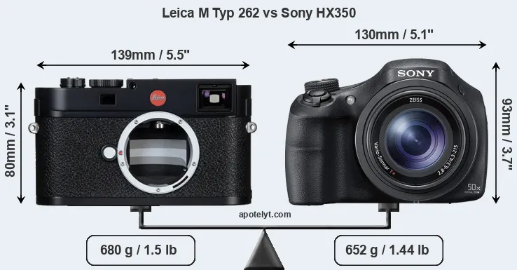 The physical size and weight of the Leica M Typ 262 and the Sony HX350 are illustrated in the side-by-side display below. The two cameras are presented according to their relative size. Three consecutive views from the front, the top, and the rear side are shown. All width, height and depth dimensions are rounded to the nearest millimeter.