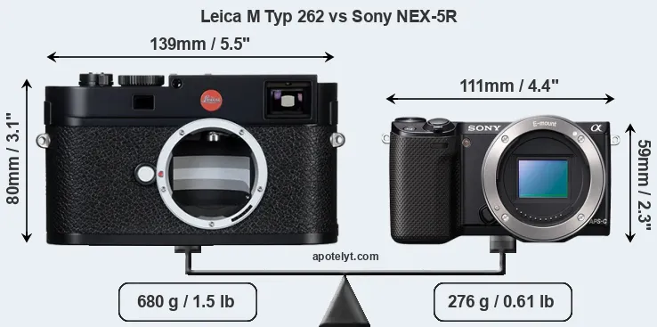 If the front view area (width x height) of the cameras is taken as an aggregate measure of their size, the Sony NEX-5R is considerably smaller (41 percent) than the Leica M Typ 262. Moreover, the NEX-5R is substantially lighter (59 percent) than the M Typ 262. It is worth mentioning in this context that the M Typ 262 is splash and dust resistant, while the NEX-5R does not feature any corresponding weather-sealing.