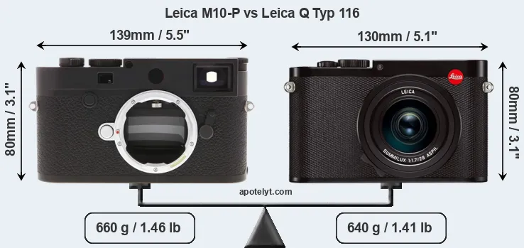 The above size and weight comparisons are to some extent incomplete and possibly misleading, as the Q Typ 116 has a lens built in, whereas the M10-P is an interchangeable lens camera that requires a separate lens. Attaching the latter will add extra weight and bulk to the setup. You can compare the optics available for the M10-P and their specifications in the Leica M Lens Catalog.