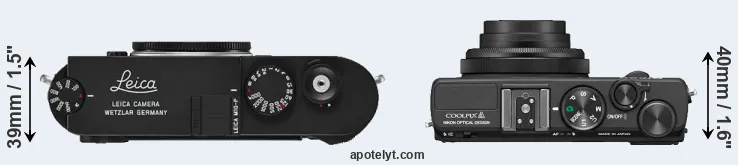 The physical size and weight of the Leica M10-P and the Nikon Coolpix A are illustrated in the side-by-side display below. The two cameras are presented according to their relative size. Three consecutive perspectives from the front, the top, and the back are available. All width, height and depth dimensions are rounded to the nearest millimeter.