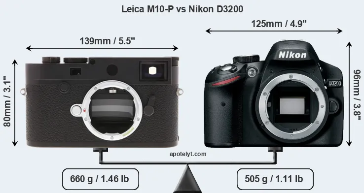 An illustration of the physical size and weight of the Leica M10-P and the Nikon D3200 is provided in the side-by-side display below. The two cameras are presented according to their relative size. Three successive views from the front, the top, and the rear are shown. All width, height and depth measures are rounded to the nearest millimeter.