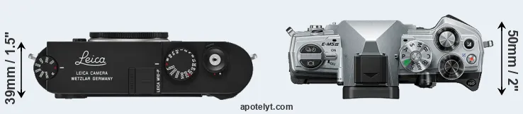 The physical size and weight of the Leica M10-P and the Olympus E-M5 III are illustrated in the side-by-side display below. The two cameras are presented according to their relative size. Three consecutive views from the front, the top, and the rear side are shown. All size dimensions are rounded to the nearest millimeter.