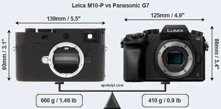 If the front view area (width x height) of the cameras is taken as an aggregate measure of their size, the Panasonic G7 is somewhat smaller (3 percent) than the Leica M10-P. Moreover, the G7 is substantially lighter (38 percent) than the M10-P. It is worth mentioning in this context that the M10-P is splash and dust resistant, while the G7 does not feature any corresponding weather-sealing.