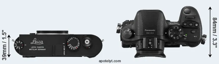 The side-by-side display below illustrates the physical size and weight of the Leica M10-P and the Panasonic GH4. The two cameras are presented according to their relative size. Three consecutive perspectives from the front, the top, and the back are available. All width, height and depth dimensions are rounded to the nearest millimeter.