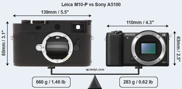 If the front view area (width x height) of the cameras is taken as an aggregate measure of their size, the Sony A5100 is considerably smaller (38 percent) than the Leica M10-P. Moreover, the A5100 is substantially lighter (57 percent) than the M10-P. It is worth mentioning in this context that the M10-P is splash and dust resistant, while the A5100 does not feature any corresponding weather-sealing.