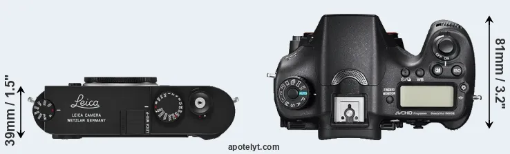 The physical size and weight of the Leica M10-P and the Sony A77 II are illustrated in the side-by-side display below. The two cameras are presented according to their relative size. Three successive views from the front, the top, and the rear are shown. All width, height and depth measures are rounded to the nearest millimeter.