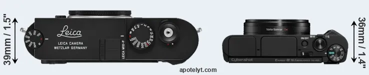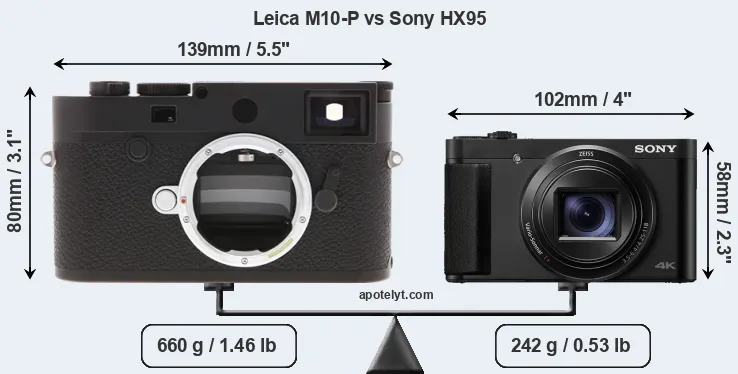 The physical size and weight of the Leica M10-P and the Sony HX95 are illustrated in the side-by-side display below. The two cameras are presented according to their relative size. Three consecutive perspectives from the front, the top, and the back are available. All width, height and depth dimensions are rounded to the nearest millimeter.