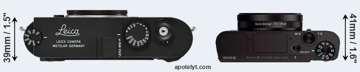 If the front view area (width x height) of the cameras is taken as an aggregate measure of their size, the Sony RX100 III is considerably smaller (47 percent) than the Leica M10-P. It is worth mentioning in this context that the M10-P is splash and dust resistant, while the RX100 III does not feature any corresponding weather-sealing.