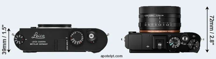 If the front view area (width x height) of the cameras is taken as an aggregate measure of their size, the Sony RX1R II is considerably smaller (34 percent) than the Leica M10-P. It is worth mentioning in this context that the M10-P is splash and dust resistant, while the RX1R II does not feature any corresponding weather-sealing.