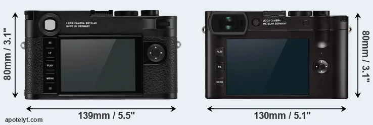 If the front view area (width x height) of the cameras is taken as an aggregate measure of their size, the Leica Q2 is notably smaller (6 percent) than the Leica M10-R. In this context, it is worth noting that both cameras are splash and dust-proof and can, hence, be used in inclement weather conditions or harsh environments.