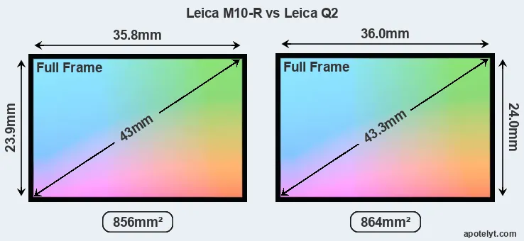 Both cameras under consideration feature a full frame sensor, but their sensors differ slightly in size. The sensor area in the Q2 is 1 percent bigger. They nevertheless have the same format factor of 1.0. Both cameras have a native aspect ratio (sensor width to sensor height) of 3:2.