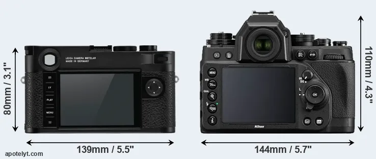 The above size and weight comparisons are to some extent incomplete since they do not consider the interchangeable lenses that both of these cameras require. Both cameras have similarly sized sensors, but DSLRs have a larger flange-to-focal plane distance than mirrorless cameras, which imposes contraints on the optical engineering process and generally leads to bigger and heavier lenses. You can compare the optics available for the two cameras in the Leica M Lens Catalog (M10-R) and the Nikon Lens Catalog (Df).