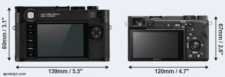 An illustration of the physical size and weight of the Leica M10-R and the Sony A6400 is provided in the side-by-side display below. The two cameras are presented according to their relative size. Three successive views from the front, the top, and the rear are shown. All width, height and depth measures are rounded to the nearest millimeter.