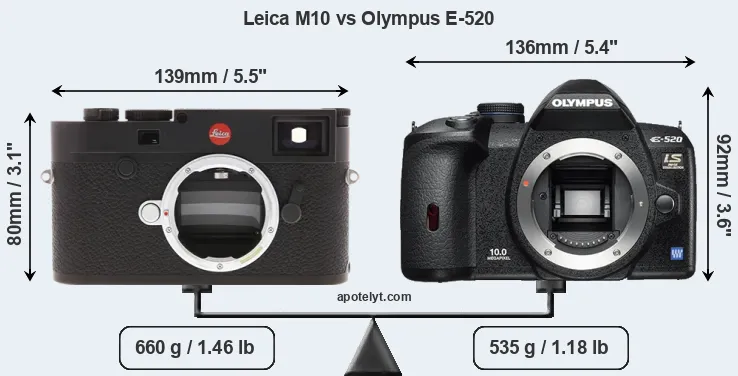 Going beyond this snapshot of core features and characteristics, what are the differences between the Leica M10 (Typ 3656) and the Olympus E-520? Which one should you buy? Read on to find out how these two cameras compare with respect to their body size, their imaging sensors, their shooting features, their input-output connections, and their reception by expert reviewers.