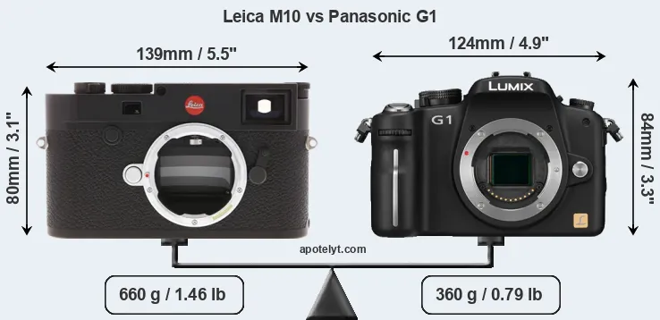 If the front view area (width x height) of the cameras is taken as an aggregate measure of their size, the Panasonic G1 is notably smaller (6 percent) than the Leica M10. Moreover, the G1 is substantially lighter (45 percent) than the M10. It is worth mentioning in this context that the M10 is splash and dust resistant, while the G1 does not feature any corresponding weather-sealing.