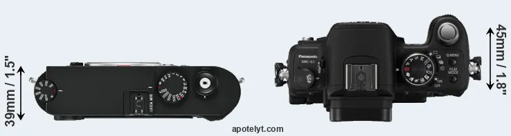 The physical size and weight of the Leica M10 and the Panasonic G1 are illustrated in the side-by-side display below. The two cameras are presented according to their relative size. Three consecutive perspectives from the front, the top, and the back are available. All size dimensions are rounded to the nearest millimeter.