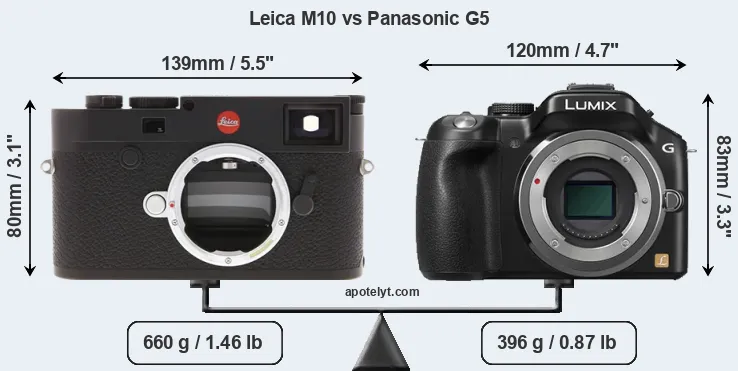 If the front view area (width x height) of the cameras is taken as an aggregate measure of their size, the Panasonic G5 is notably smaller (10 percent) than the Leica M10. Moreover, the G5 is substantially lighter (40 percent) than the M10. It is worth mentioning in this context that the M10 is splash and dust resistant, while the G5 does not feature any corresponding weather-sealing.