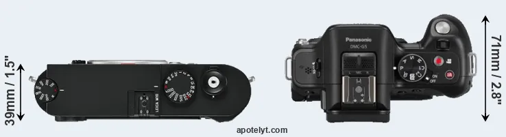 The side-by-side display below illustrates the physical size and weight of the Leica M10 and the Panasonic G5. The two cameras are presented according to their relative size. Three successive views from the front, the top, and the rear are shown. All width, height and depth dimensions are rounded to the nearest millimeter.