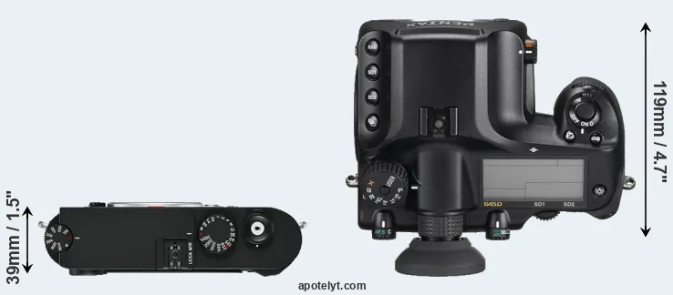 The side-by-side display below illustrates the physical size and weight of the Leica M10 and the Pentax 645D. The two cameras are presented according to their relative size. Three successive views from the front, the top, and the rear are shown. All width, height and depth measures are rounded to the nearest millimeter.