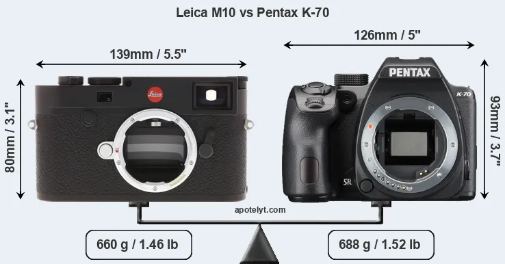 Going beyond this snapshot of core features and characteristics, what are the differences between the Leica M10 (Typ 3656) and the Pentax K-70? Which one should you buy? Read on to find out how these two cameras compare with respect to their body size, their imaging sensors, their shooting features, their input-output connections, and their reception by expert reviewers.