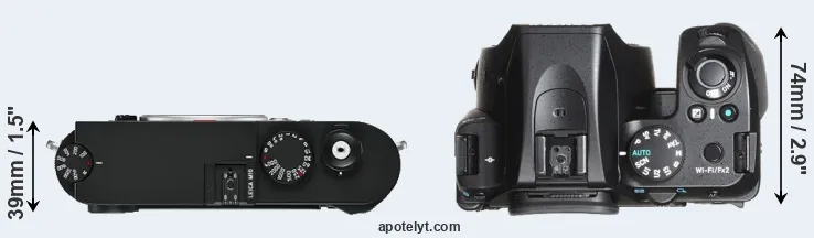 The side-by-side display below illustrates the physical size and weight of the Leica M10 and the Pentax K-70. The two cameras are presented according to their relative size. Three successive views from the front, the top, and the rear are shown. All size dimensions are rounded to the nearest millimeter.