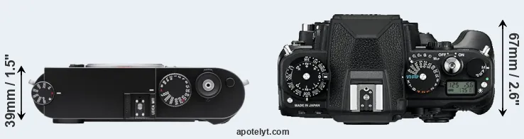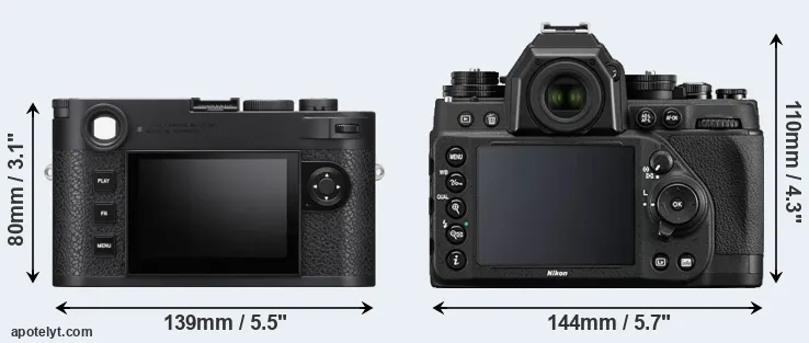 The above size and weight comparisons are to some extent incomplete since they do not consider the interchangeable lenses that both of these cameras require. Both cameras have similarly sized sensors, but DSLRs have a larger flange-to-focal plane distance than mirrorless cameras, which imposes contraints on the optical engineering process and generally leads to bigger and heavier lenses. You can compare the optics available for the two cameras in the Leica M Lens Catalog (M11) and the Nikon Lens Catalog (Df).