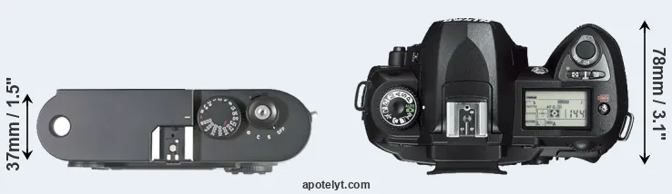 The side-by-side display below illustrates the physical size and weight of the Leica M8 and the Nikon D70s. The two cameras are presented according to their relative size. Three consecutive views from the front, the top, and the rear side are shown. All width, height and depth measures are rounded to the nearest millimeter.