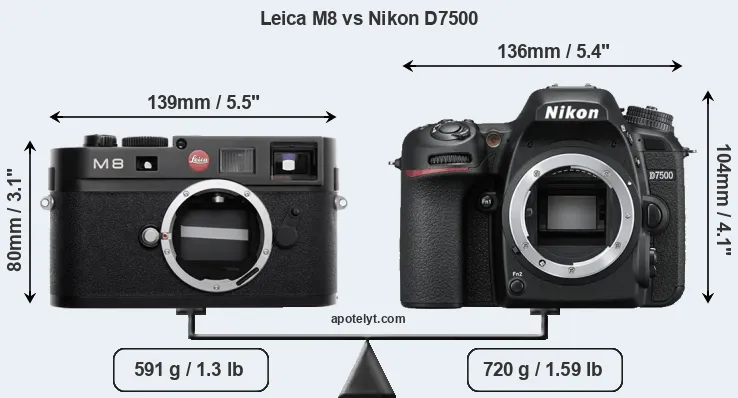 If the front view area (width x height) of the cameras is taken as an aggregate measure of their size, the Nikon D7500 is notably larger (27 percent) than the Leica M8. Moreover, the D7500 is markedly heavier (22 percent) than the M8. It is noteworthy in this context that the D7500 is splash and dust-proof, while the M8 does not feature any corresponding weather-sealing.