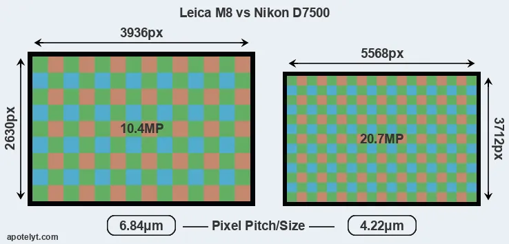 Despite having a smaller sensor, the D7500 offers a higher resolution of 20.7 megapixels, compared with 10.4 MP of the M8. This megapixels advantage comes at the cost of a higher pixel density and a smaller size of the individual pixel (with a pixel pitch of 4.22μm versus 6.84μm for the M8). However, it should be noted that the D7500 is much more recent (by 10 years and 7 months) than the M8, and its sensor will have benefitted from technological advances during this time that make it possible to gather light more efficiently. Coming back to sensor resolution, it should be mentioned that neither of the two cameras has an anti-alias filter installed, so they are able to capture all the detail the sensor resolves.
