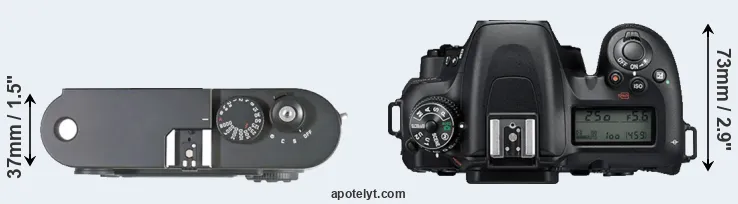 The physical size and weight of the Leica M8 and the Nikon D7500 are illustrated in the side-by-side display below. The two cameras are presented according to their relative size. Three successive views from the front, the top, and the rear are shown. All width, height and depth dimensions are rounded to the nearest millimeter.