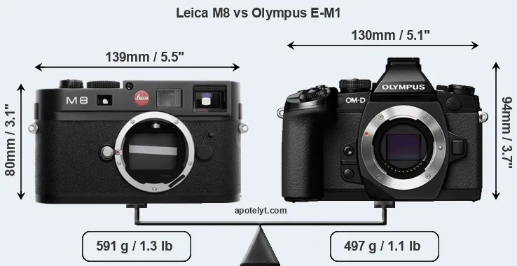 If the front view area (width x height) of the cameras is taken as an aggregate measure of their size, the Olympus E-M1 is notably larger (10 percent) than the Leica M8. However, the E-M1 is markedly lighter (16 percent) than the M8. It is noteworthy in this context that the E-M1 is splash and dust-proof, while the M8 does not feature any corresponding weather-sealing.