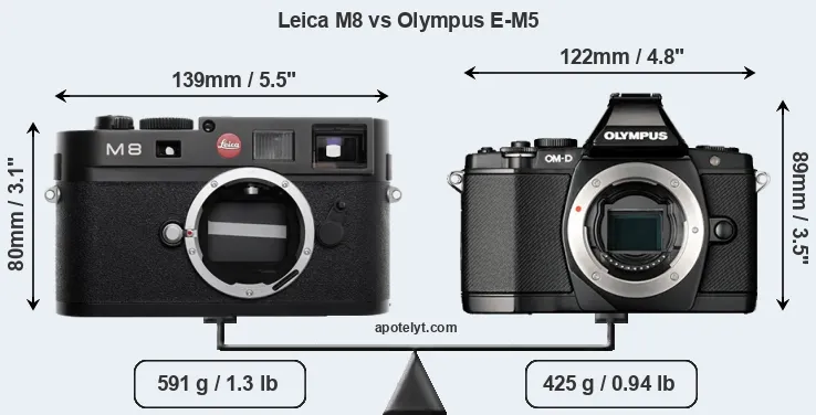 If the front view area (width x height) of the cameras is taken as an aggregate measure of their size, the Olympus E-M5 is somewhat smaller (2 percent) than the Leica M8. Moreover, the E-M5 is markedly lighter (28 percent) than the M8. It is noteworthy in this context that the E-M5 is splash and dust-proof, while the M8 does not feature any corresponding weather-sealing.