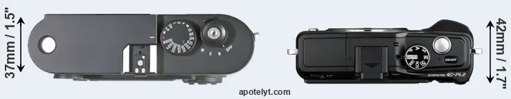 An illustration of the physical size and weight of the Leica M8 and the Olympus E-PL2 is provided in the side-by-side display below. The two cameras are presented according to their relative size. Three consecutive perspectives from the front, the top, and the back are available. All size dimensions are rounded to the nearest millimeter.