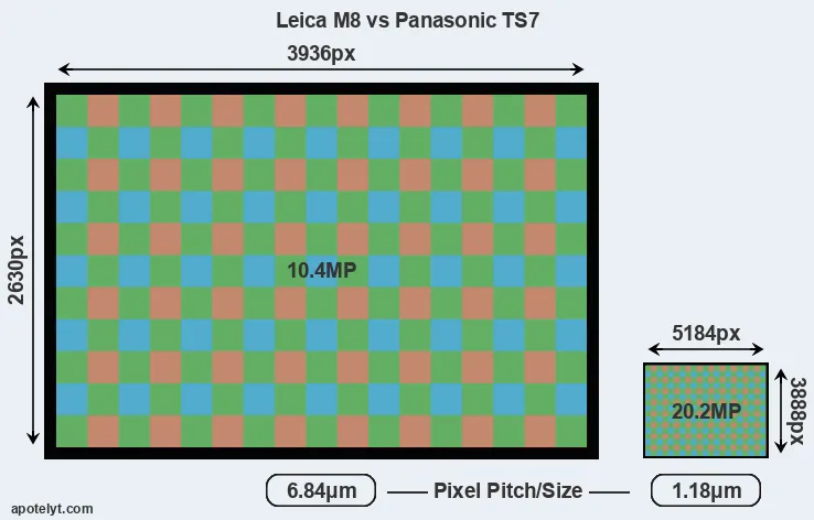 Despite having a smaller sensor, the TS7 offers a higher resolution of 20.2 megapixels, compared with 10.4 MP of the M8. This megapixels advantage comes at the cost of a higher pixel density and a smaller size of the individual pixel (with a pixel pitch of 1.18μm versus 6.84μm for the M8). However, it should be noted that the TS7 is much more recent (by 11 years and 7 months) than the M8, and its sensor will have benefitted from technological advances during this time that make it possible to gather light more efficiently. Coming back to sensor resolution, it should be mentioned that the M8 has no anti-alias filter installed, so that it can capture all the detail its sensor resolves.