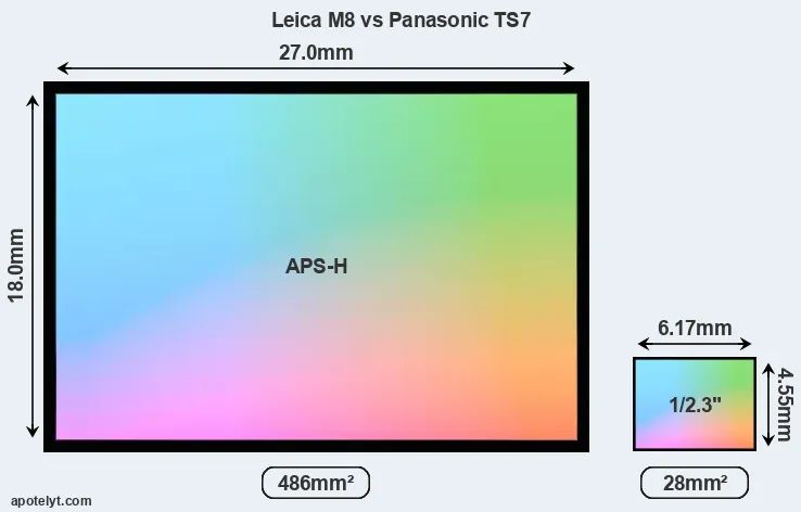 Of the two cameras under consideration, the Leica M8 features an APS-H sensor and the Panasonic TS7 a 1/2.3-inch sensor. The sensor area in the TS7 is 94 percent smaller. As a result of these sensor size differences, the cameras have a format factor of, respectively, 1.3 and 5.6. The sensor in the M8 has a native 3:2 aspect ratio, while the one in the TS7 offers a 4:3 aspect.