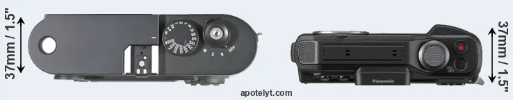 The side-by-side display below illustrates the physical size and weight of the Leica M8 and the Panasonic TS7. The two cameras are presented according to their relative size. Three successive views from the front, the top, and the rear are shown. All size dimensions are rounded to the nearest millimeter.