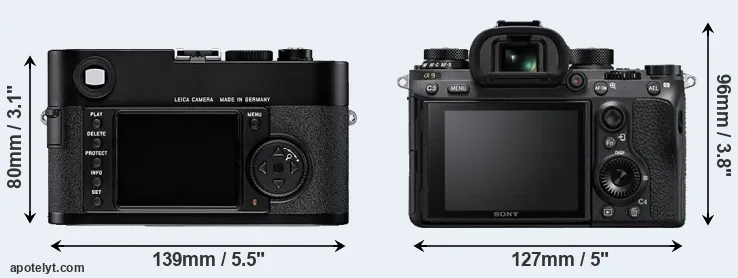 If the front view area (width x height) of the cameras is taken as an aggregate measure of their size, the Sony A9 is notably larger (10 percent) than the Leica M8. Moreover, the A9 is markedly heavier (14 percent) than the M8. It is noteworthy in this context that the A9 is splash and dust-proof, while the M8 does not feature any corresponding weather-sealing.