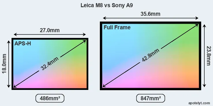 Of the two cameras under consideration, the Leica M8 features an APS-H sensor and the Sony A9 a full frame sensor. The sensor area in the A9 is 74 percent bigger. As a result of these sensor size differences, the cameras have a format factor of, respectively, 1.3 and 1.0. Both cameras have a native aspect ratio (sensor width to sensor height) of 3:2.