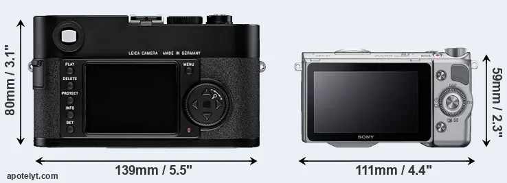 The side-by-side display below illustrates the physical size and weight of the Leica M8 and the Sony NEX-5T. The two cameras are presented according to their relative size. Three consecutive perspectives from the front, the top, and the back are available. All width, height and depth dimensions are rounded to the nearest millimeter.