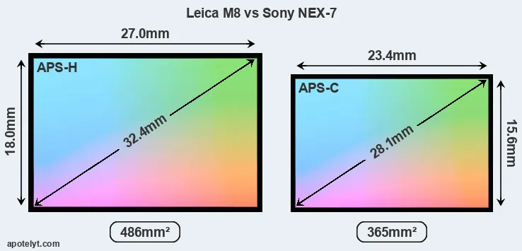 Of the two cameras under consideration, the Leica M8 features an APS-H sensor and the Sony NEX-7 an APS-C sensor. The sensor area in the NEX-7 is 25 percent smaller. As a result of these sensor size differences, the cameras have a format factor of, respectively, 1.3 and 1.5. Both cameras have a native aspect ratio (sensor width to sensor height) of 3:2.