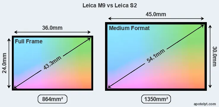 Of the two cameras under consideration, the Leica M9 features a full frame sensor and the Leica S2 a medium format sensor. The sensor area in the S2 is 56 percent bigger. As a result of these sensor size differences, the cameras have a format factor of, respectively, 1.0 and 0.8. Both cameras have a native aspect ratio (sensor width to sensor height) of 3:2.