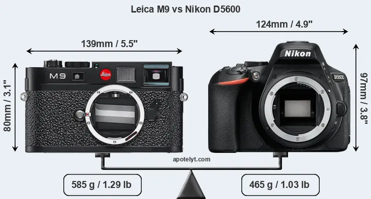 The physical size and weight of the Leica M9 and the Nikon D5600 are illustrated in the side-by-side display below. The two cameras are presented according to their relative size. Three consecutive perspectives from the front, the top, and the back are available. All size dimensions are rounded to the nearest millimeter.