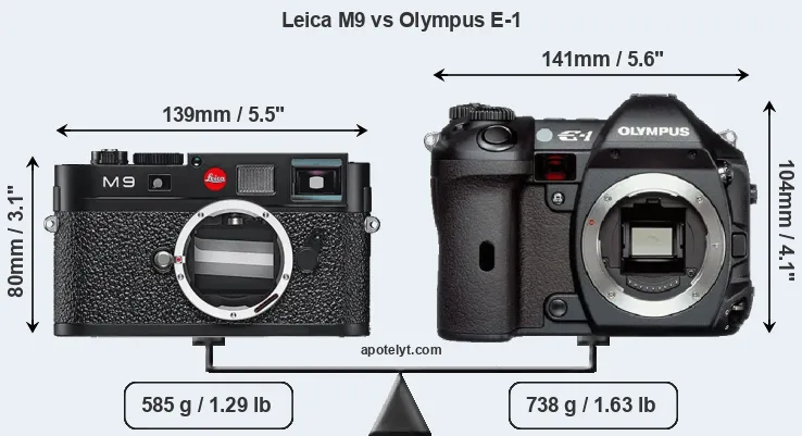 If the front view area (width x height) of the cameras is taken as an aggregate measure of their size, the Olympus E-1 is notably larger (32 percent) than the Leica M9. Moreover, the E-1 is markedly heavier (26 percent) than the M9. It is noteworthy in this context that the E-1 is splash and dust-proof, while the M9 does not feature any corresponding weather-sealing.
