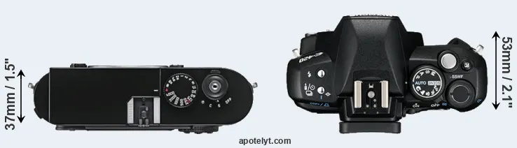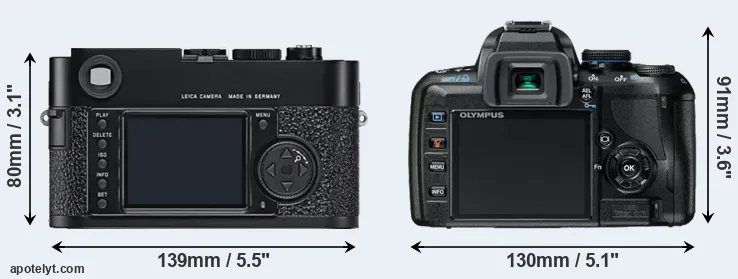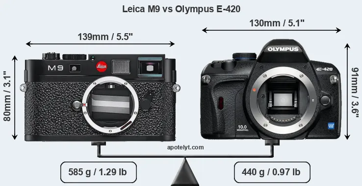 The physical size and weight of the Leica M9 and the Olympus E-420 are illustrated in the side-by-side display below. The two cameras are presented according to their relative size. Three consecutive perspectives from the front, the top, and the back are available. All width, height and depth measures are rounded to the nearest millimeter.