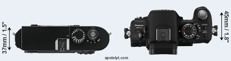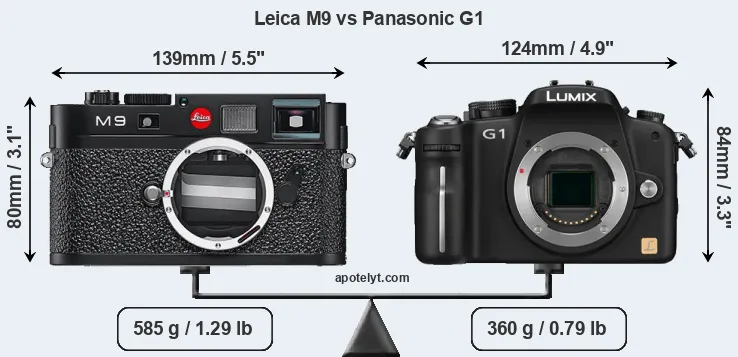 An illustration of the physical size and weight of the Leica M9 and the Panasonic G1 is provided in the side-by-side display below. The two cameras are presented according to their relative size. Three consecutive perspectives from the front, the top, and the back are available. All width, height and depth measures are rounded to the nearest millimeter.