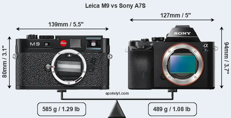 If the front view area (width x height) of the cameras is taken as an aggregate measure of their size, the Sony A7S is notably larger (7 percent) than the Leica M9. However, the A7S is markedly lighter (16 percent) than the M9. It is noteworthy in this context that the A7S is splash and dust-proof, while the M9 does not feature any corresponding weather-sealing.