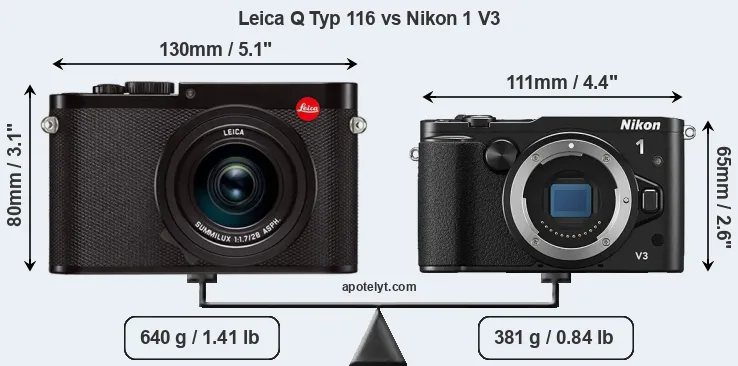 An illustration of the physical size and weight of the Leica Q Typ 116 and the Nikon 1 V3 is provided in the side-by-side display below. The two cameras are presented according to their relative size. Three successive views from the front, the top, and the rear are shown. All size dimensions are rounded to the nearest millimeter.